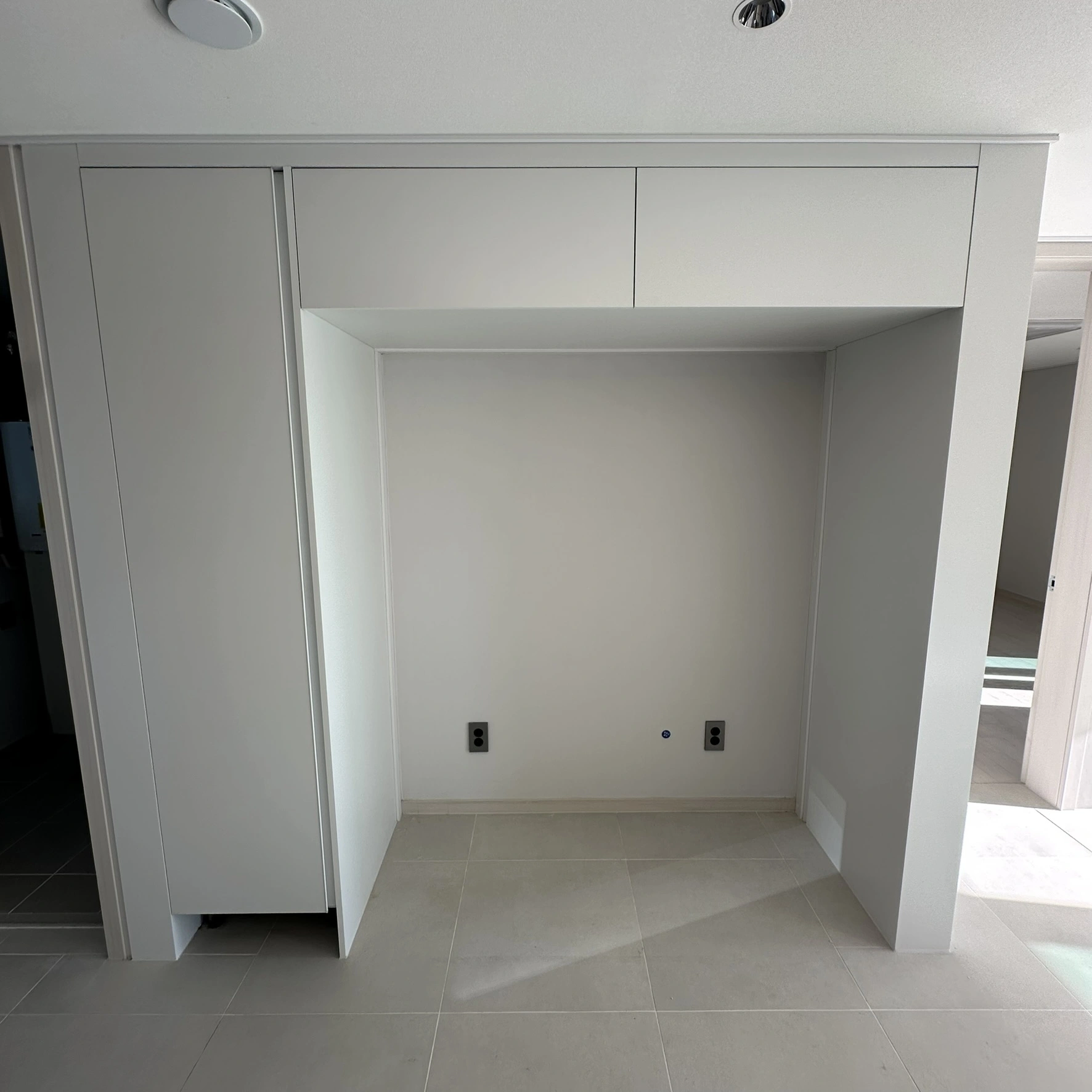 붙박이장 철거 후 노출된 공간에 냉장고 상단 수납장을 새로 제작 설치하고, 스포트라이트 조명을 더해 냉장고 공간을 완성한 시공입니다.